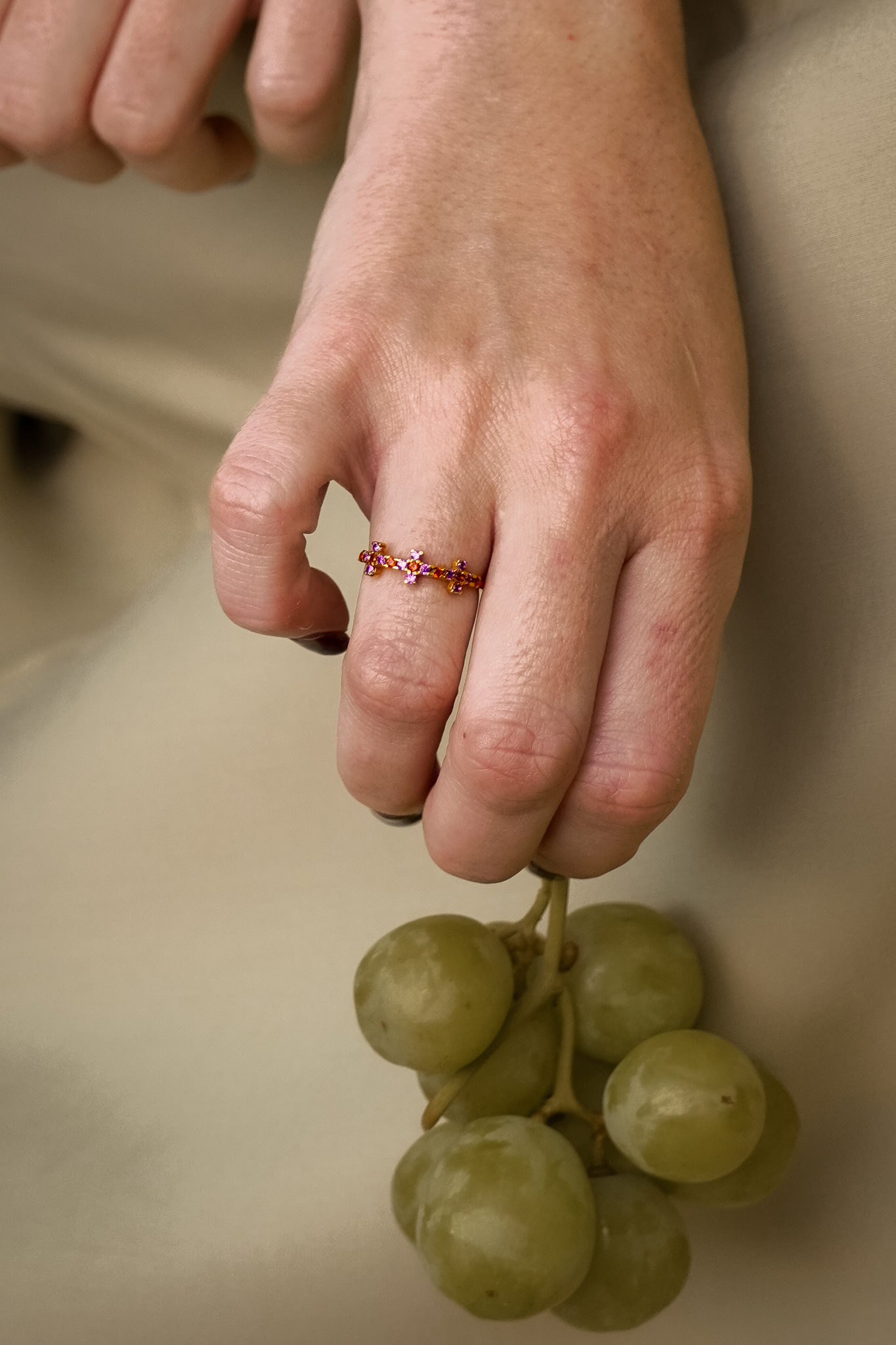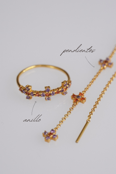 Anillo de plata de ley bañada en oro de 18 kt, adornado con circonitas naranjas y lilas en forma de cruz.